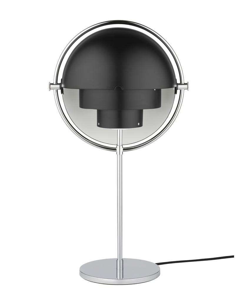 Die verstellbare Gubi Multi-Lite Tischleuchte ist ein außergewöhnliches Lichtobjekt, das es zuvor so noch nicht gegeben hat. Der Designer Louis Weisdorf kombinierte hier im Jahre 1972 drei geometrische Grundformen miteinander zu einer ganz besonderen Designleuchte. So besteht die Multi-Lite aus zwei feststehenden Zylindern, die von einem Kreis und einer zweigeteilten Halbkugel umgeben werden. Die beiden Hälften der Halbkugel sind frei beweglich und laden so zum Spielen und Experimentieren mit Form und Licht ein.