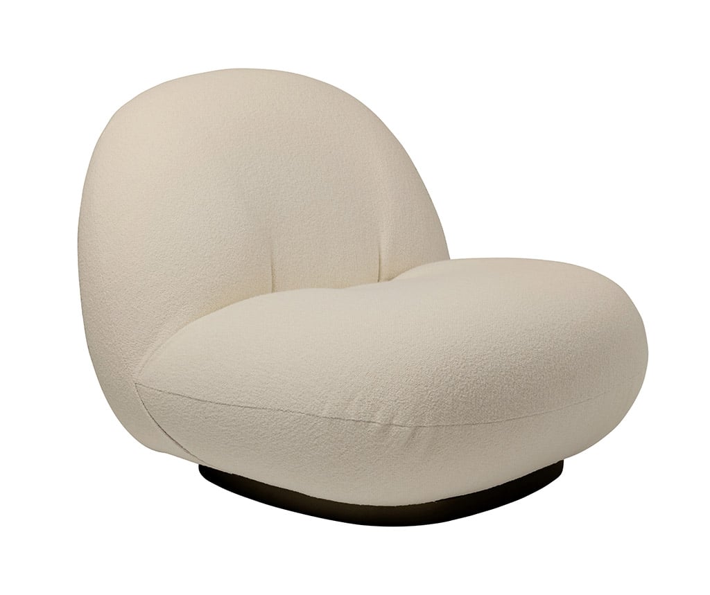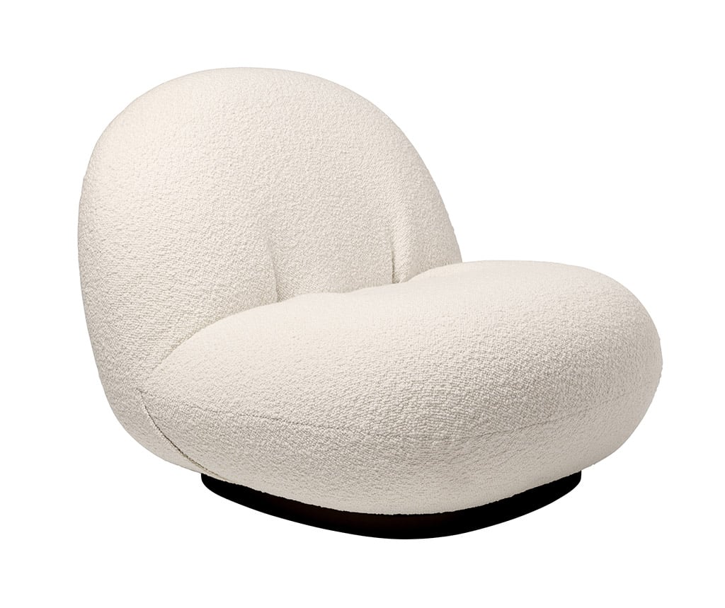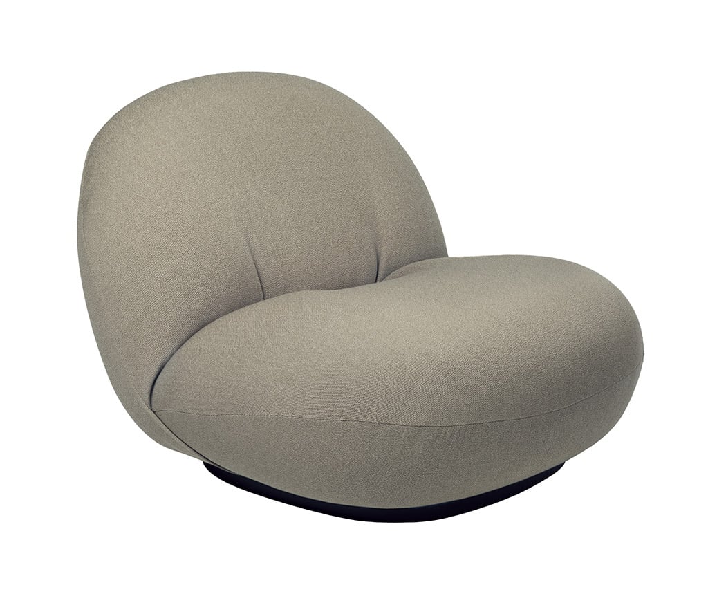 Der Gubi Pacha Lounge Chair Sessel, drehbare Basis schwarz ist klein, aber sehr bequem. Er ist Teil der Pacha Kollection entworfen von Pierre Paulin bei dem die Basis in die Grundstellung zurückfährt und somit optisch im Raum bei Nichtgebrauch immer in der gleichen Position bleibt. Die ersten Skizzen, die der französische Designer Pierre Paulin (1927–2009) für die spätere Pacha Kollektion zeichnete, waren einfache Bleistiftkonturen, die an illustrative Wolken erinnerten. Aus einer dieser Entwürfe wurde der Pacha Lounge Chair, der 1975 auf den Markt kam und als Wegbereiter für ein niedriges Wohnen und eine neue Art des Sitzens diente. Ohne den Zwang der Beine zeugte er von Komfort und der Gemütlichkeit des niedrigen Wohnens. 2018 wurde der Pacha Lounge Chair vom dänischen Erfolgslabel Gubi neu aufgelegt und um einige Varianten erweitert.