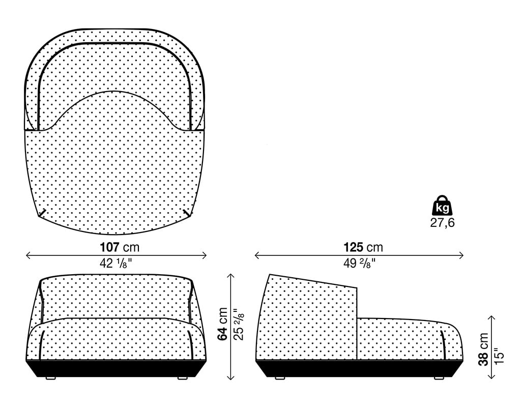 Die hier angebotene Version des Kristalia Brioni Outdoor Loungesessel large ist am Unterteil mit schwarzem PVC-Gewebe gepolstert, welches den direkten Kontakt zwischen dem Boden und dem oberen Bezug verhindert. Dies ermöglicht eine bessere und strapazierfähigere Nutzung im Outdoorbereich und gibt der Serie gleichzeitig einen einheitlichen Designlook, auch wenn die oberen Stofffarben unterschiedlich gewählt werden. Es besteht auch die Möglichkeit, den Kristalia Brioni Outdoor Loungesessel large komplett mit einem Stoff beziehen zu lassen (und somit ohne dem schwarzen PVC-Gewebe an der Unterseite). In diesem Fall bietet sich eine Nutzung eher im Innenbereich an, oder es empfiehlt sich, sollte der Loungesessel auch draußen Einsatz finden, die erhöhten Füße aus schwarz lackiertem Stahl separat dazuzukaufen.