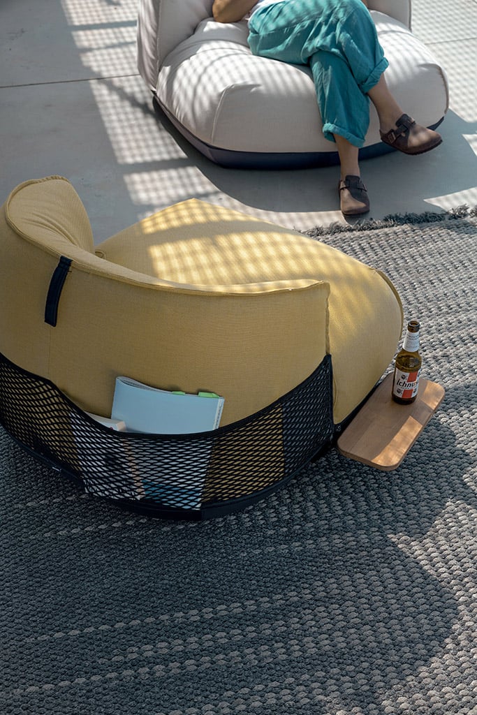 Einige Elemente der Serie werden mit neuen Zubehörteilen vervollständigt, die dem Aussehen und dem Komfort der Sitzmöbel eine persönliche Note schenken. Das Ziel: In vollen Zügen und mit so wenig Aufwand wie möglich den Garten, die Terrasse oder den Poolbereich zu genießen. Zu den universellen Zubehörteilen zählen die Füße aus schwarz lackiertem Stahl, die die Sitzfläche vom Boden anheben und für mehr Komfort sorgen. Für die Lounge-Sessel und Liegen gibt es hingegen auch ein Verstellset mit Griff zur Bedienung des Vorderrads. Und dann noch die seitliche Ablage aus Fenix-NTM® oder Teakholz und die hintere Tasche aus Netzmaterial. All diese Zubehörteile sind im Lieferumfang nicht enthalten und können separat dazubestellt werden - sprechen Sie uns hierfür jetzt an.