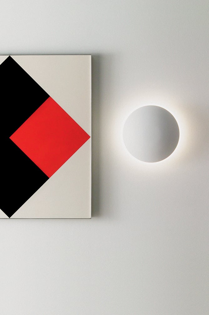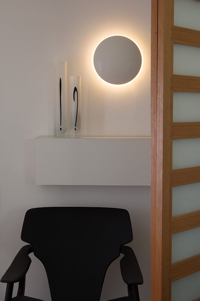 Die Lumini Eclipse Wandleuchte von Designer Fernando Prado macht ihrem Namen alle Ehre: Wie eine Sonnenfinsternis sorgt sie hinter der flachen Scheibe für eine stimmungsvolle Lichtwirkung. Die puristische Lumini Eclipse eignet sich sowohl für Flure und Eingangsbereiche als auch für Wohn- und Schlafräume.