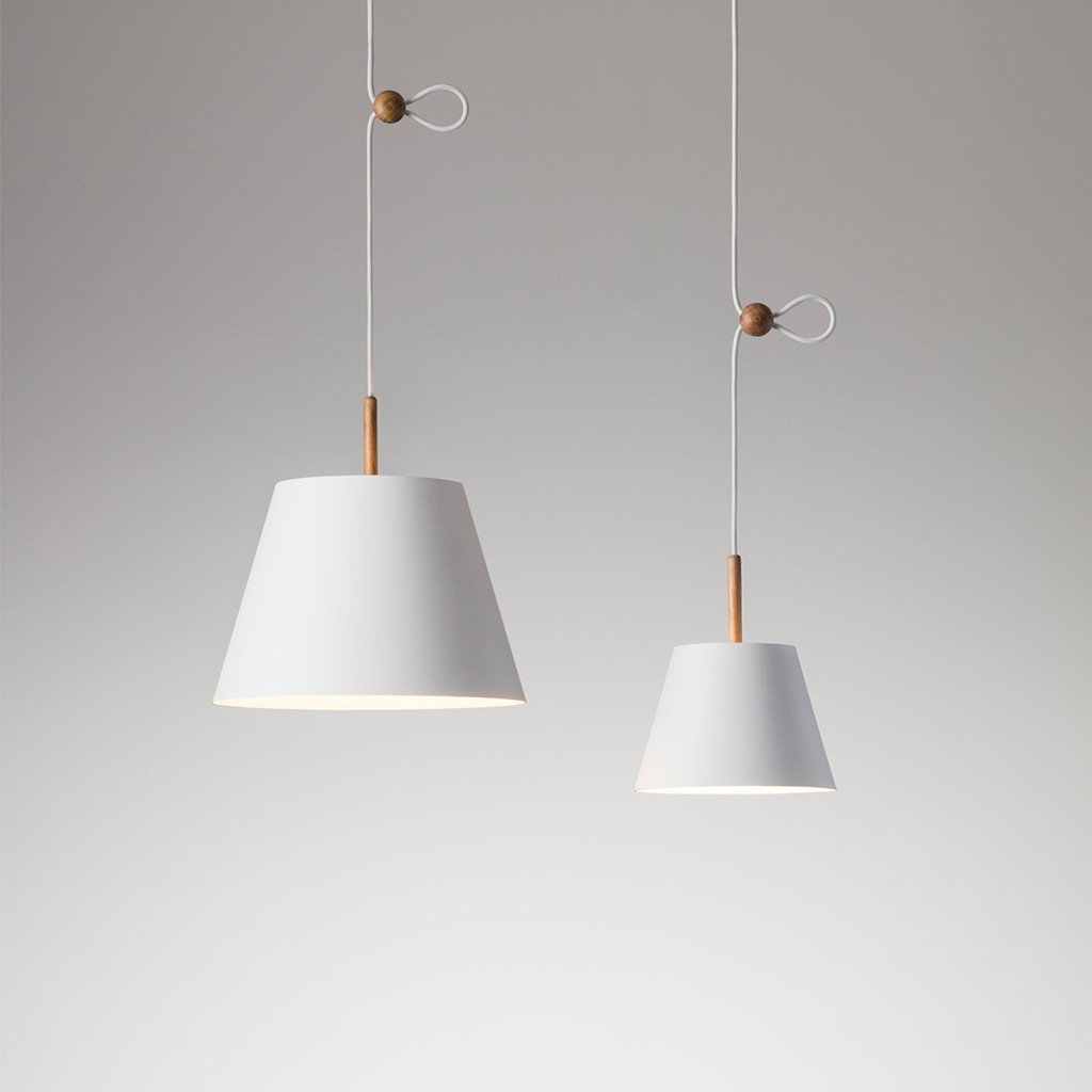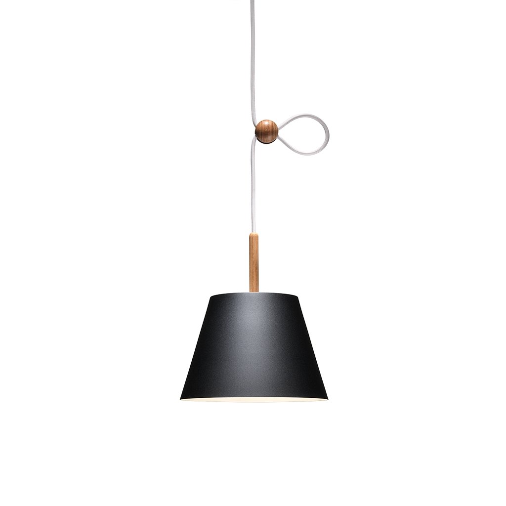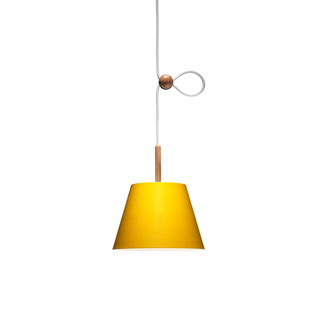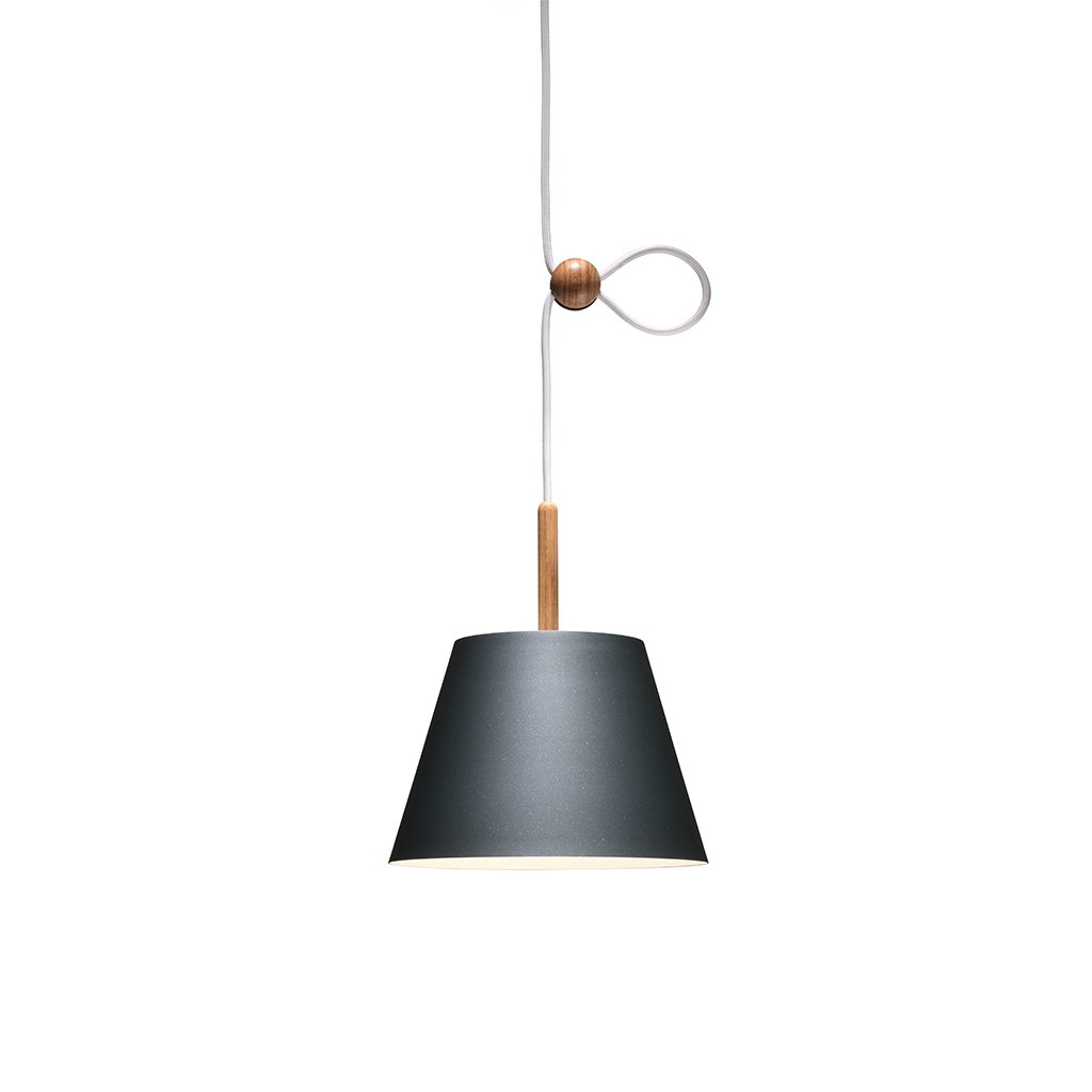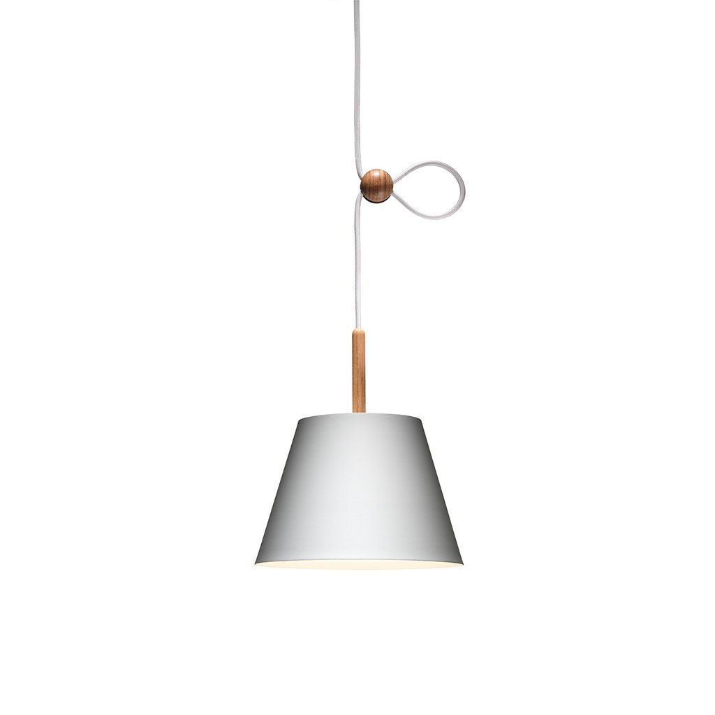 Die Lumini Vinte2 Pendelleuchte besteht aus einem konisch geformten Schirm aus lackiertem Aluminium. Auf der Oberseite befindet sich ein schmaler Holzstab, aus dem das Pendel hervorgeht. Eine kleine Holzkugel dient zur Höhenverstellung, wodurch die Lumini Mini Vinte2 Pendelleuchte an verschiedene Raumhöhen oder Einsatzbereiche angepasst werden kann. Das langlebige, energieeffiziente LED-Element gibt ihr warmweißes (2700° K) Licht gleichmäßig sanft nach unten hin ab und ist zudem dimmbar.