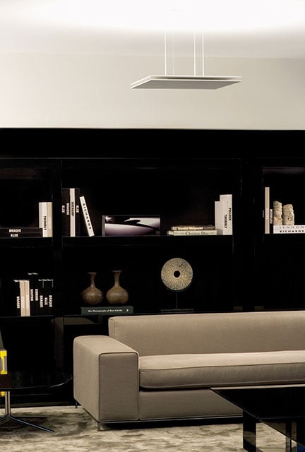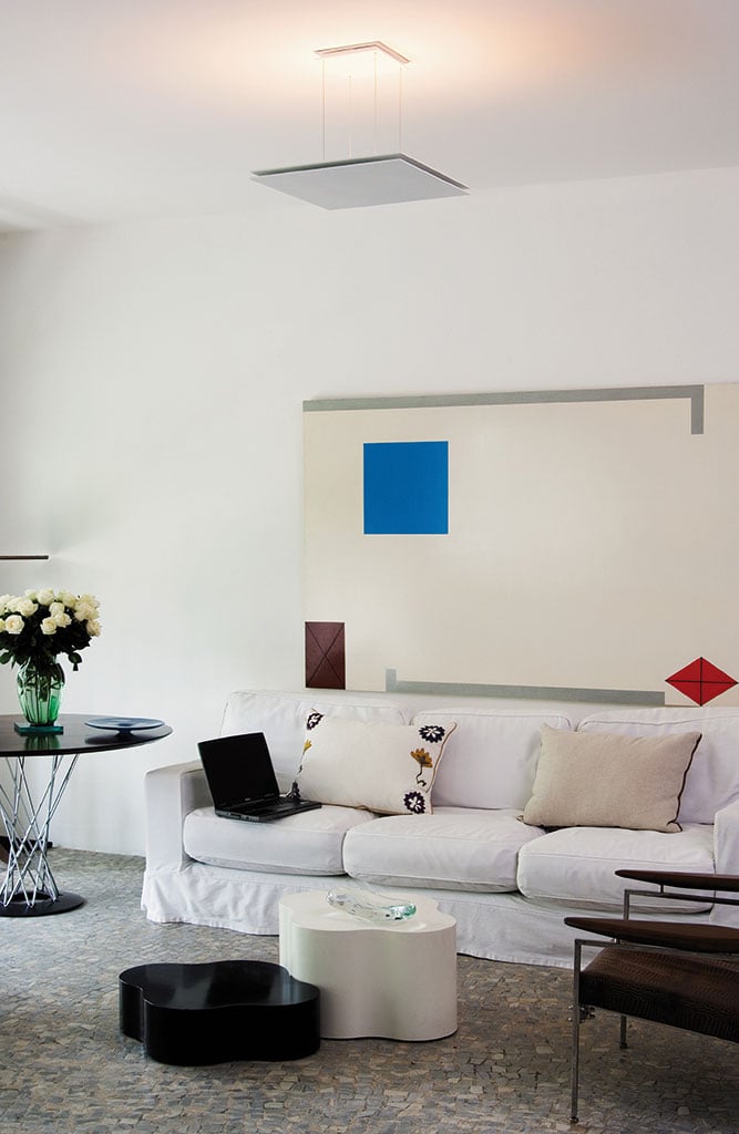 Purismus in seiner Reinform verkörpern die Lumini Quadratta Pendelleuchte und die kleinere Lumini Quadrattinha Pendelleuchte von Fernando Prado. Die flachen Scheiben aus Aluminium verbergen das Leuchtmittel, so dass das Licht blendfrei zur Decke hin abgegeben wird. Durch die zarten, isolierten Abhängungen ist keine weiter Stromzufuhr nötig und die Leuchten scheinen wie von Zauberhand im Raum zum schweben.